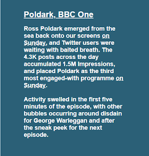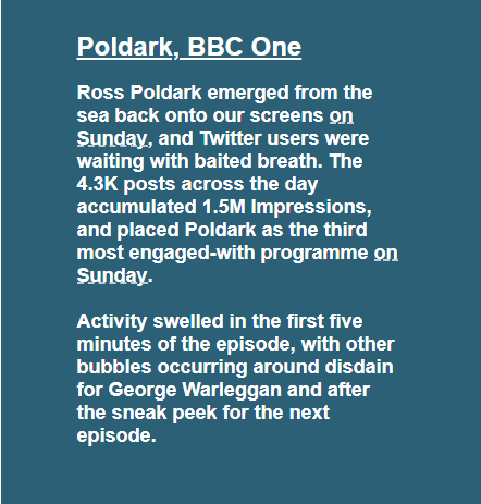 The first episode of Poldark series four was the third most engaged-with programme on Twitter on Sunday according to Kantar Media. It received 4.3 thousand posts during the day giving 1.5 million impressions. Love Island came top with 60.2K tweets and 26 M impressions.