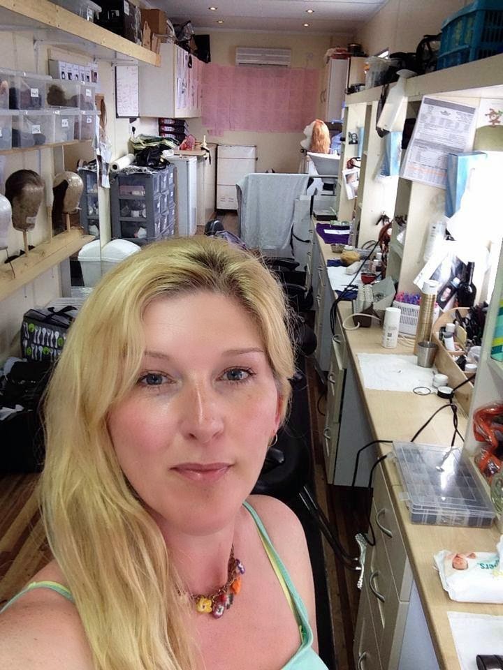 Here she is in the make-up trailer where she works