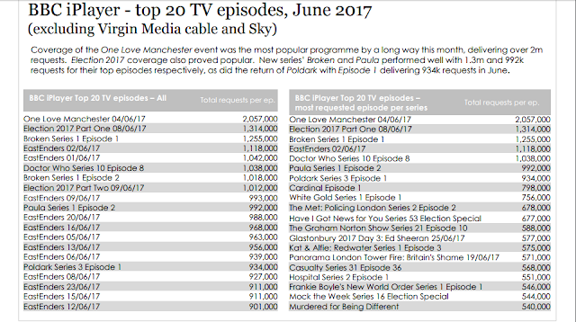 The episode received 934,000 requests making it sixteenth in the All TV Episodes chart. In the top and second spots are One Love Manchester with over 2 million requests and Election 2017 (1.3m). Three Poldark episodes aired in June meaning episodes two and three had fewer than 901k requests (see the chart below).