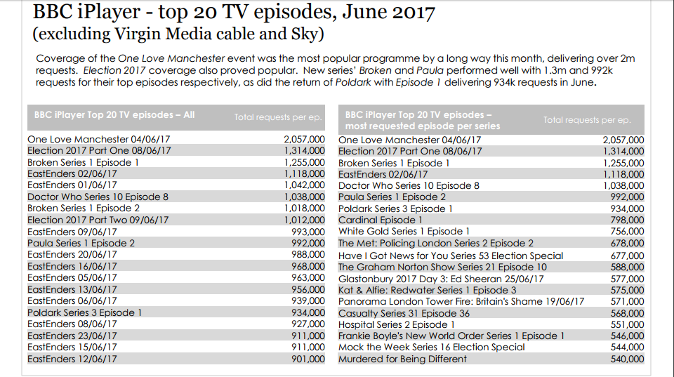 The episode received 934,000 requests making it sixteenth in the All TV Episodes chart. In the top and second spots are One Love Manchester with over 2 million requests and Election 2017 (1.3m). Three Poldark episodes aired in June meaning episodes two and three had fewer than 901k requests (see the chart below).