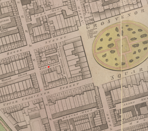 There were several King Streets in London in the early 1800s but Grosvenor Gate identifies this King Street as the one off Grosvenor Square. King Street became Northop Street in 1886 and then Culross Street in 1899 according to