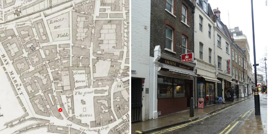 | Map: Locating London's Past (5) Present day Whitcomb Street (Hedge Lane)
