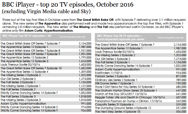 Here is the BBC iplayer Top 20. Please also see the following notes: