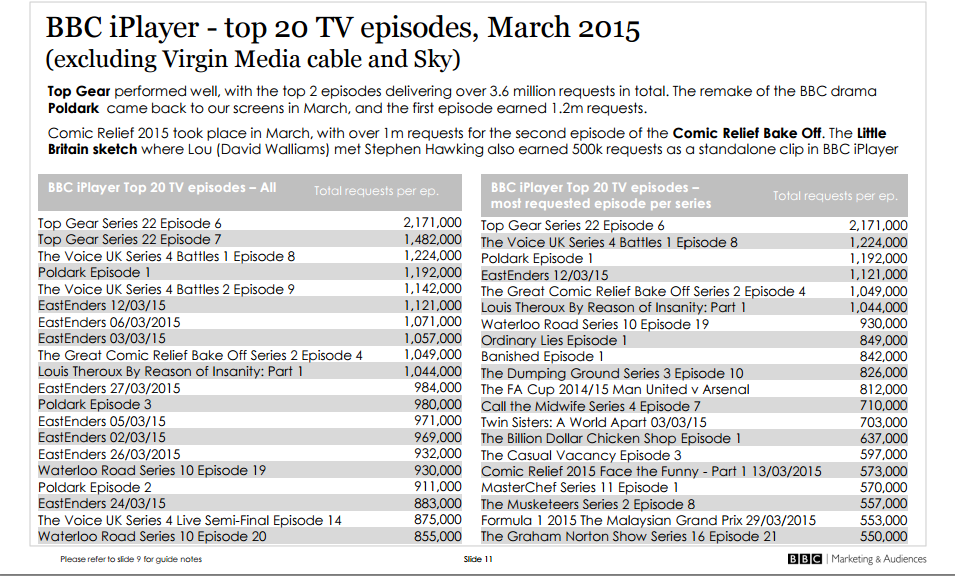 In March, 2015 Poldark episode 1 earned almost 1.2 million requests. This was the most requested episode of Poldark and put it at number four in the iplayer top 20 TV episodes. Episode 3 of Poldark was in 12th place and Episode 2 in 17th place with 980,000 and 911,000 respectively. Please see the 'Notes for Figures in This Report' below.